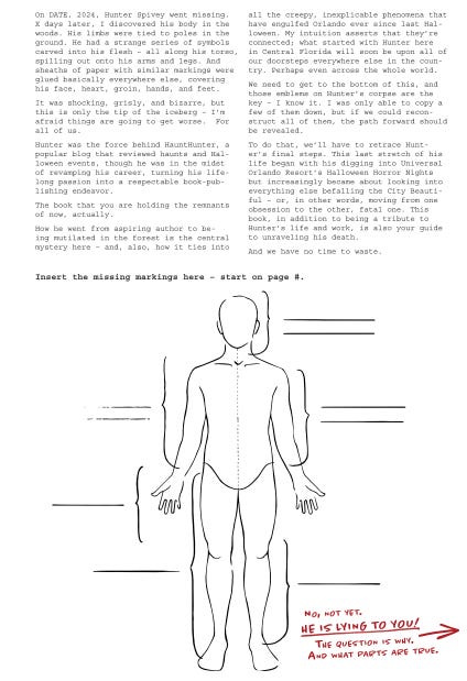 The second page may, upon first blush, seem like we’re already backing off that dramatic gauntlet-throwing, but, in fact, it has a lot going on under the hood: this is the merging of our unusual layout and interactivity with a standard book page, submerging the more unique aspects of our atmospheric undertaking so that they lurk threateningly (or is that promisingly?) right under the surface. And all of this starts with Writer 1’s explanation of what you, as the reader, will need to do regarding that mysterious, stop-you-in-your-tracks body diagram on the previous page – recreate a series of strange sigils upon it, symbols that, supposedly, the unnamed editor/narrator/mastermind had witnessed upon the real Hunter’s real body. Yes, this means that, at certain strategic points throughout the book, you’ll need to flip back to the very first page, continuing to fill it in with your drawings (yet another reason why this was placed where it was, to allow for perpetual easy access).
