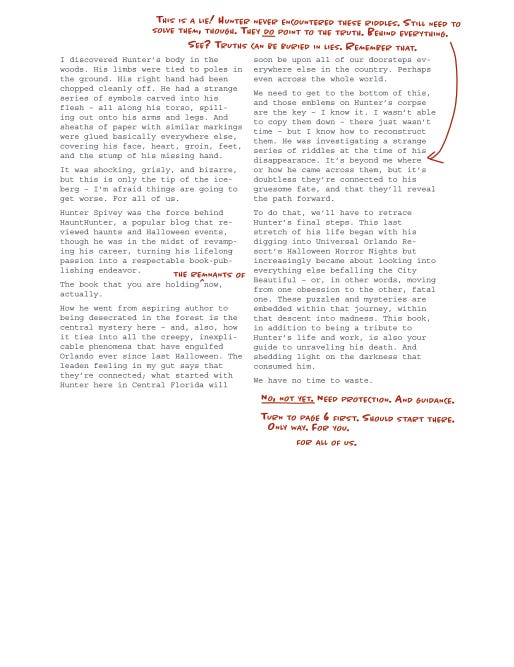 (Missed our first post and need just a quick primer on Hunter? Easy: he’s a former haunt blogger who decided to go all-in on HHN Orlando, got caught up in wider, weirder events, and ended up missing in short order. A mysterious figure, who’s referred to as Writer 1 among us creators, intervened, finished his book, and shipped it off to you in the hopes of “helping” you discover what happened to the fan-favorite social-media personality – and, more importantly, why.)