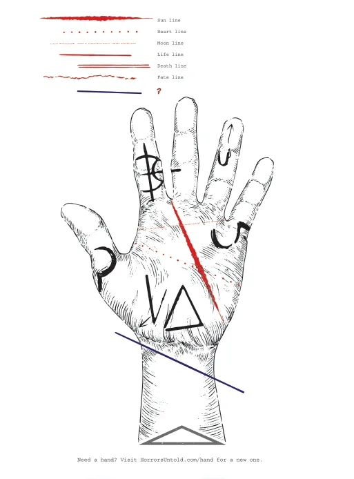 The idea behind the hand itself – and, more specifically, using it as the puzzle-solving star of the show – originated from our chief gameplay designer, Mairi Nolan, who thought that it was a far more interesting, dynamic, and visceral solution than the standard “widget” (say, a viewfinder of some sort that would have a window to highlight one word and arrows that would point to others on the page, thereby incorporating them into the solution) that is normally used for other, similar projects. This proposal accomplished several tasks all at once: it was immersive for horror readers and a novelty for puzzle fans; it made Writer 1’s challenges much more ingrained into his and Hunter’s storyline; it was gruesome but not graphic, walking the fine line that all of us on the creative team had laid out for ourselves; and, perhaps most noteworthy of all, it made some of our playtesters a little squeamish, since the human hand is not made to be bent or contorted in the ways that Mairi needed it to in order to reveal the witchy sigils that would then be inscribed upon the diagram of Hunter Spivey’s corpse back on the first page. In other words, this one little suggestion resulted in wins across the board for us and for our little project.