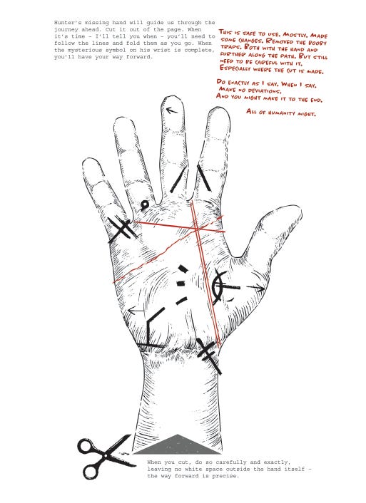 The third and fourth pages keep this convoluted ball rolling by introducing the ritualistically sacrificed Hunter Spivey’s hand, the core gameplay mechanic that will allow you to solve all the riddles that have been slipped into the book by the enigmatic Writer 1. By this point, of course, we have already made clear that dear Hunter’s hand was chopped clean off, but we still hoped that finding it (or, at least, an artistic rendition of it) on the very next page would be something of a surprise – taking a pair of scissors and cutting part of a human limb out of a book in order to bend and fold it in various ways to solve puzzles, after all, is something that doesn’t quite happen over the course of a normal reading day. And, actually, speaking of which, it is this very act – cutting this beautifully designed and produced book – that should really start to send shockwaves through you; just minutes into Horrors Untold, we’re asking you to not only do some pretty unusual things, but ones that also permanently alter your book. This, however, isn’t only for pure shock value – such actions indelibly mark your progress through the whole journey, almost making the book, as one member of our creative team put it, into your personal journal (or, repeating ourselves from last time, it eradicates the physical barrier between you and the story, making it an external extension of your changing internal reality).